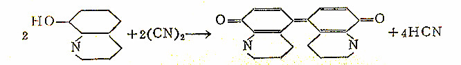 将因多氰离子的产生而受到阻止,或至少有了降低,但此外配价結合的氰,也許会依下式使8-羟基喹啉氧化成醌型产物: