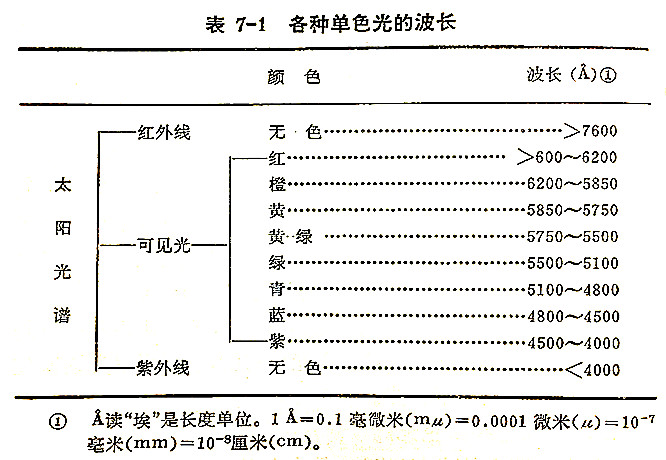 白光,即自然光(日光),是由七种颜色组成的,通常称为太阳光谱。各种单色光的波长范围如表7-1所示。