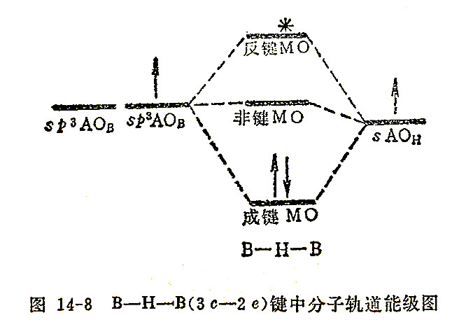 在B2H6分子中,共有14个价轨道(硼原子的电子层由1s22s22p1激发为1s22s12p2之后,进行sp3杂化,两个原子共有8个价轨道,六个氢原子有6个价轨道),但只有12个价电子(硼的4个sp3杂化轨道中只有3个轨道上有电子,另一个轨道是空着的),所以它是缺电子分子。在这个分子中,有δ个价电子用于2个硼原子各与2个氢原子形成2个B—Hσ键,这4个σ键在同一平面。剩下的4个价电子在2个硼原子和2个氢原子之间形成了垂直于上述平面的两个三中心-电子键,一个在平面之上,另一个在平面之下(见图14-7)每个三中心两电子键是由一个氢原子和两个硼原子共用2个电子构成的。结构实验指明这个氢原子具有桥状结构,称为“桥氢原子”,它把两个硼原子连接起来了。这种三中心两电子键是由三个原子(2个B,1个H)轨道组成三个分子轨道——成键、反键、非键轨道(其能级与原来的硼原子的一样),而让2个电子填充在成键轨道上形成的(见图14-8)。所以在B2H6分子中共有两种键:B—H(2c-2e)硼氢键和