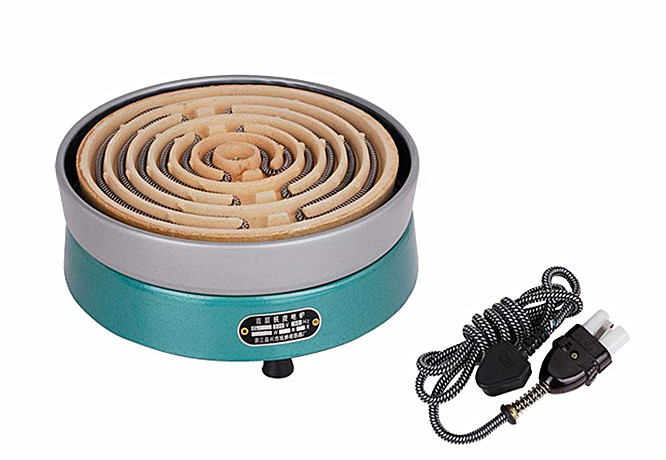 电炉的构造是很简单的,一条电炉丝嵌在耐火泥炉盘的凹槽中,炉盘固定在一个铁盘座上,电炉丝两头套上多节小瓷管后连接到瓷接线柱上与电源线相连,即成为一个普通的圆盘式电炉。