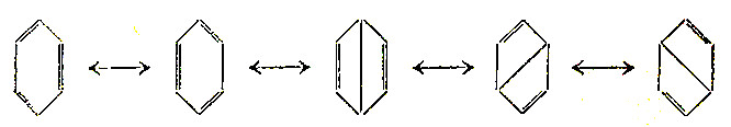 共振论者认为苯分子在基态时存在着下列五种不同的结构,而它的真实结构是“共振”于这些结构之间,并用双箭头↔表示共振,将这五种共振结构连接起来以表示苯分子:
