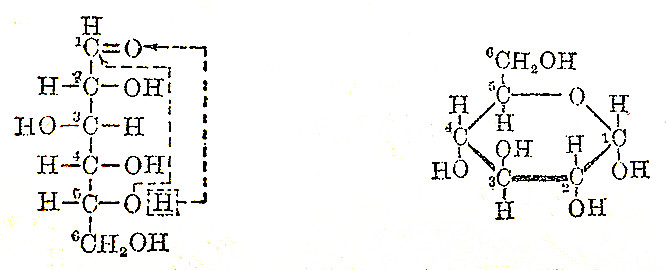 通过对葡萄糖溶液的光学特性以及其他实验的测定,于是人们提出葡萄糖的结构是环状半缩醛的结构。即在大多数情况和结晶的状态下,葡萄糖主要是六员氧环(或叫吡喃环),它是由醛基和第五碳原子(C5)上羟基形成的半缩醛(一般醛基能被ROH加成,得到半缩醛和缩醛)。如果把这种环状结构用六角形环表示,则有如下右的立体结构形状。环的平面与纸垂直,把开链式中位于C原子左方的H或OH写在环的上