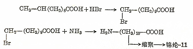 庚醛是合成香料的重要原料,10-十一烯酸甲酯在酸性情况下水解得到10-十一烯酸,然后将其与HBr加成,并用氨取代分子中的溴原子后,得到11-氨基十一酸,再加以缩聚就得到锦纶-11塑料: