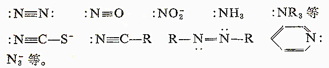 在通常的情况下(例如在RCN,O2N-,SCN-,R3N中),N原子主要是一个σ电子给予体,并不需要进一步讨论。N2和NO的情况在下一章中与CO和其它有关的配位体一起讨论。下面讨论N原子(或氮离子)和少数其它特殊情况。