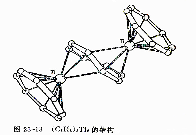 已经指出,环辛烯分子本身不是芳香族的,但它却生成许多络合物,其中仍保留它那种聚烯型的特点。然而有些分子中它是作为一个平面的芳香型的配位体,换句话说,这时能把它看成是C8H82-离子(即芳香型10个电子体系)连结到一个足够大的金属原子上从而有效地同这样大的环重叠在一起。已知的化合物为(C8H8)2U和(C8H8)2Th,并且用X-射线衍射证实了芳烃-金属的特性。用5f轨道的参与成键来解释这些倒系络合物的金属到环的键合。d区金属的对称C8H8-M键合的唯一例子是在(C8H8)Ti2中发现的。其结构如图23-13所示。到C8H8环中心的键合,在这里是十分特殊的,而且还没有详细分析过。