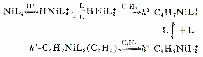 h3-巴豆酰基[1-甲基烯丙基,CH2=CH—CH(CH3)—]和乙烯偶合,接着由得到的烯丙基除去一个β-氢,得到1,4-己二烯并再生氢化镍络合物。