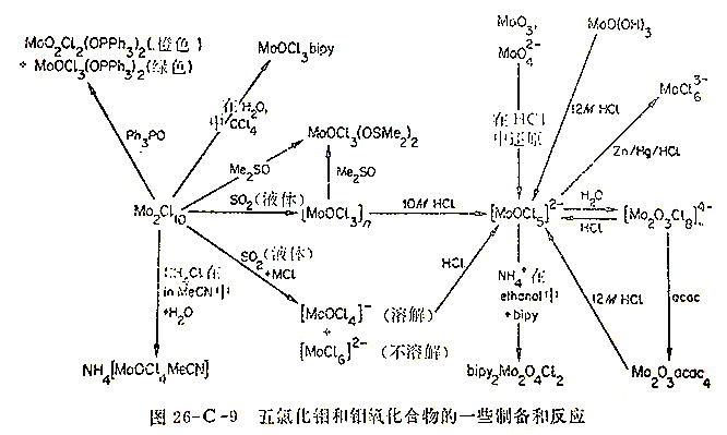 直接氯化金属可以形成Mo2Cl10,它有适当的探发性,在蒸气中是单体,它也许有三角双锥结构。但是在结晶中形成具有氯桥的二聚体于是每个钼有六个配位体。Mo2Cl10是顺磁性的,其磁矩(μ有效=1.64玻尔磁子在293K),表示只不计两个钼原子(Mo—Mo=3.84Å)电子的自旋偶合。Mo2Cl10溶解在苯中也溶介在有更大极性的有机溶剂中。它在溶液中是单体同时假定它有溶剂化物。它容易从含氧溶剂中抽出氧而产生氧络合物,同时它也被胺还原成胺基络合物。它很快的被水解。它们的一些反应见图26-C-8和26-C-9,其中提出了制备低价氯化物和氯氧化物的方法。