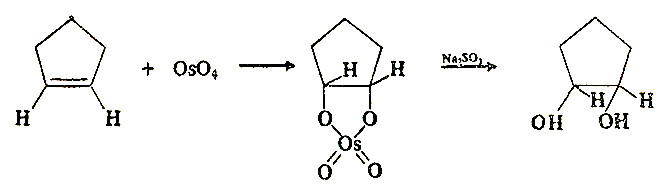 二种化合物均是四面体结构。它们极易溶于CCl4中,并且用CCl4可以从水溶液中萃取它们。RuO4完全溶于稀的硫酸中产生金黄色的溶液;OsO4是微溶性的。它们四氧化物都是强氧化剂。~180℃以上,RuO4能爆炸,产生RuO2和O2,而光使它慢慢地分解;在对热、光稳定性两方面,OsO4更为稳定。发现OsO4在有机化学中有专门的用处,由于它能够加成到烯烃的双键上产生顺式酯,然后又能被Na2SO3还原成顺式-二羟基化合物: