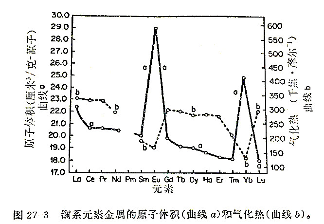 原子体积,密度和金属的某些其它物理性质,除了Eu和Yb(偶而有Sm和Tm)以外,沿着系列平滑地变化。例如,图27-3表明了原子体积和气化热的曲线。恰好在以二价状态存在具有最大倾向的镧系元素处发生偏差;可以假定这些元素倾向只提供两个电子给金属的导带,因此剩下较大原子实使键力降低。
