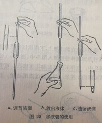 移液管在使用前的洗涤方法与滴定管相分别用洗涤液、水及去离子水洗涤外,还用少量要移取的液体洗涤,可先慢慢地吸入洗涤的水或液体至移液管中,用食指按住图22移液管的使用口,然后将移液管平持,松开食指,转动移液至,使洗的水或液体与管口以下的内壁充分接触。再将移液管持直,让洗涤水或液体流出,如此反复洗涤数次。
