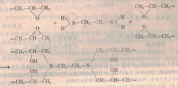 在环氧树脂中加入固化剂(如乙二胺)时,由于固化剂与环氧树脂的环氧基或羟基起反应,形成体型结构,因而使环氧树脂固化。