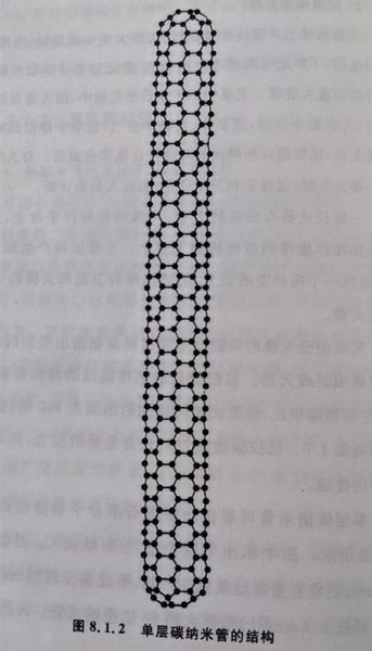 单层碳钠米管可看做由层形石墨分子卷曲而成,如图8.1.2所示。图中示出的管的直径和球碳C。相似,约为1.0nm。若将它紧密地集東在一起,形成头发粗细的纤维(头发直径按0.1mm计)需要大约90亿根纳米管。再用这种纤维做成缆绳.