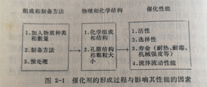催化剂的上述性质,是由催化剂的化学组成和化学的以及物理的结构所决定的。后者又取决于催化剂的成分、含量、制法和预处理。这样,我们可以把催化剂的形成过程和依次影响的因素示于图2-1