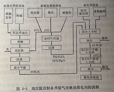 水煤气变换所用催化剂是沉淀法制备催化剂的一个例子,其示意流程如图2-2所示。这是一个促进CO+H2O≒CO2+H2反应的铁基催化剂。制备步骤包括: