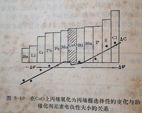 助催化剂元素电负性的大小,对丙烯在氧化亚铜一氧化铜催化剂上氧化为丙烯选择性的影响,也出现了与乙烯在银催化剂上氧化为环氧乙烷相似的规律(图5-10)。
