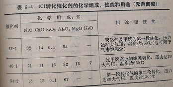 性质都有影响。作为例子,英国ICI公司的三种转化催化剂的化学组成、性能和用途列于表6-4。