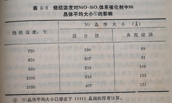 催化剂中镍晶体随着烧温度的升高而变大。例如对NiO-SiO2体系,烧结温度(750~1050℃)对由共沉淀法和混合法制备的催化剂中镍晶体大小的影响,列于表6-9。