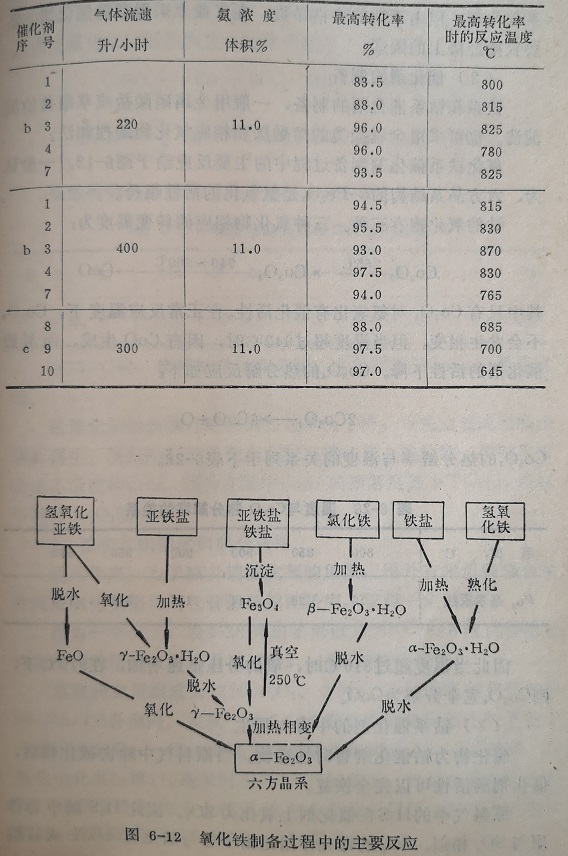 氧化铁系側化剂制备过程中的主要反应于图6-12。一般认为,六方晶系结构的a-FeO2是氨氧化的活性组份。的氧化物有三种。三种氧化物相应的转变温度为