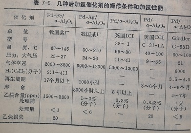 后加氢是将C2和C3分别进行加氢。C2加氢加入氢气的量一般控制H2/C2H2在2~3:1(克分子)。若氢气的浓度降到接近化学计算的浓度,例如H2/C2/H2=1:2:1,空速必须下降到氢过量时的1/10。加氢用的催化剂广泛采用载于Al2O3上含钯量较低的催化剂(<0.05%),操作条件取决于杂质的含量,一般为40~150℃,1~35大气压。当H2/C2H2=2~3:1时,气体空速为2000~4000小时。C的加氢主要是除甲基乙炔和丙二烯,这时也采用PdAl2O3催化剂,操作条件取H2/C2H2=3:1时,温度为150~200,压力为1~20大气压,气体空速为1300~4500小时。表7-5列出了一些催化剂的操作条件和加氢性能。