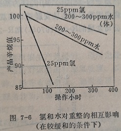 当使用氯处理的催化剂时,反应混合物必须保持一定的氯和水的比例。这对维持催化剂的高活性有一定影响。氯和水不论那一种过量都会影响催化剂的活性和稳定性(图7-4,图7-5),并使裂化反应的速度加快,这是不希望的,有人认为反应混合物中水的含量应在20 ppm左右。当小于这个数值时,原料中的烷烃发生高度的加氢裂化,另一方面当水含量过高时,催化剂上的氯与水反应生成HCI而挥发,催化剂的活性则因过量的氯化物而下降。反过来氯含量不足时和加入过量的水所起的不良影响一样。因此氯不足时应加入有机氮来提高氧含量。含水量低时,应在原料中加水,复和水也互有协同作用(图7-6),。对于用一定方法制备的含有一定浓度话化剂的僵化剂,必须确定开工和催化剂复活的特定条件,并找出氯和水间最佳的比例。