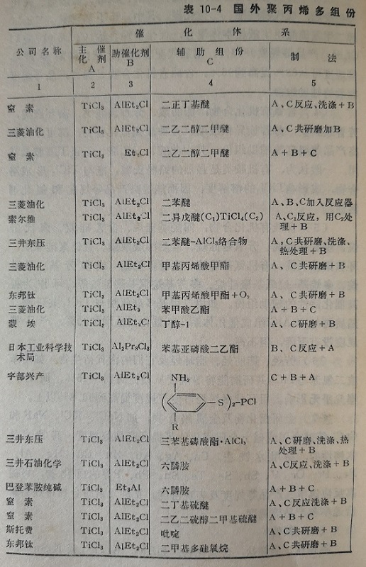 含硼化物:如硼酸三乙酯,离子交换树脂,烷基苯磺酸钠盐,O2, H2O, 卤素, CaO3, H2SO4, H2PO3,Na2SO4无机酸酯如Et,PO,, NaoH,烷基铝,等均可作辅助组份,提高催化剂活性、产品等规度、聚合速度,改进产品加工、机械性能。