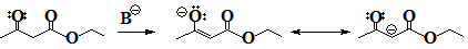 注意:乙酰乙酸乙酯(EAA)在碱性条件下形成的负离子,负电荷在氧原子上更合理(因为氧原子的电负性比碳大得多,更容易携带负电荷),极限式2比1的内能低,因此2的贡献比1大。所以在书写反应机理时,遇到这种离子,写成2更合理。