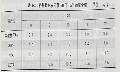 ②稳定pH化学清洗时,保持洗液的pH相对稳定非常关键,助剂在水溶液中具有碱性缓冲能力,保持溶液的pH相对稳定,另外碱性助剂可以使油污中的脂肪酸皂化。pH对助剂的螯合能力也有很大影响。各种助剂在不同pH下对Ca²+的螯合值如表1-2所示。