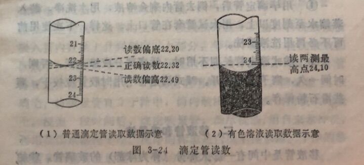 ⑥为了协助读数,可采用读数卡,这种方法有利于初学者练习读数,读数卡可用黑纸或涂有黑长方形(约3x1.5厘米)的白纸制成,读数时,将读数卡放在滴定管背后,使黑色部分在弯月面下约1毫米处,,此时即可看到弯月面的反射层成 为黑色如图3-26所示,然后读此黑色弯月面下缘的最低点。