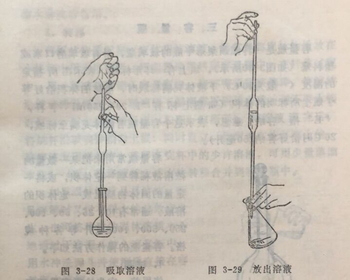 用右手的拇指和中指捏住移波管或吸量管的上端,物管的下口插入欲取的溶液中,插入不要太浅或太深,太浅会产生哪空,把溶液吸到洗耳球内弄脏溶液,太深又会在管外沾附络液过多。左手拿洗耳球,接在管的上口把溶液慢慢吸入,如图328所示,先吸入移液管或吸量管容量的1/3左右,取出,横持,并转动管子使溶液接触到刻度以上部位,以置换内壁的水分,然后将溶液从管的下口放出并弃去,如此用欲取溶液淋洗2~3次后,即可吸取溶液至刻度以上,立即用右手的食指按住管口(右手的食指应稍带潮湿,便于调节液面)。