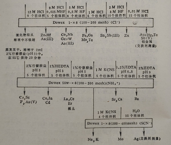 6、3节)。由于待分离离子的量很少,就可以用少量离子交换剂并且在较短的时间内完成分离。取决于原始混合物的组成以及所拥有的元素测定方法,在有些情况下只需将元素分离成组就行了,虽然有时候必需完全分离成各个元素组分。当把一个样品系统地分辨成许多种组分的时候,常常利用一些已知的分离方案。这样的方案中包含着痕量元素与基本元素的分离,痕量元素的组分离,最后还有同一组分的元素分离成各别组份。