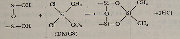 显然,硅烷化的主要目的是为了除尽支持体表面上的经基基团,以使之疏水化。目前,应用最普遍的硅烷化试剂是二甲基二氯硅烷(DMCS)和三甲基一氯硅烷(TMCS)。经过这些试剂处理后,亲水性物质表面上的硅醇基(Si-OH)将有效地转变成甲硅烷醚基(一Si-O-Si-),它们的反应机制是: