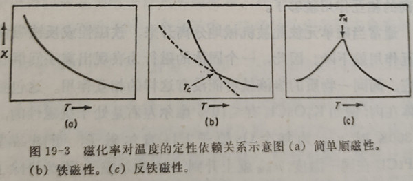 19-3比较了(a)简单顺磁性。(b)铁磁性。(c)反铁磁性三者的磁化率对温度的定性的依赖关系。当然(a)正是居里定律的一个粗略图形。在(b)中应当注意到在某个被称为居里温度的Tc处,图形是不连续的。在高于居里温度时,物质服从居里或居里-威斯定律;这就是说它是简单顺磁性物质。然而在低于居里温度时,磁化率以一种不同的方式随温度变化并且也与场强有关。对于反铁磁性,也有一个特征温度Tn,称为奈耳(Néel)温度。在Tn之上物质具有简单顺磁性的行为,但是在Ts以下,磁化率随温度降低而下降。