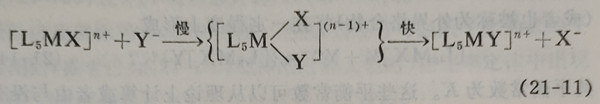这里重要的特征是失掉X~的第一步相对说进行缓慢,因此它就决定了全部过程进行的速率。换句话说,一旦这个五配位中间络合物形成了,则它与新的配位体Y~的反应几乎是瞬时的。这样一个过程的速率定律是: