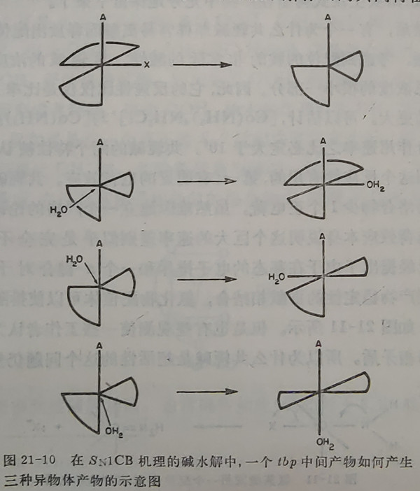 当然,SN1CB机理要求反应的络合物在一个非排除的配位体上至少有一个可质子化的氢原子,而且这个氢的反应速率比配位体取代的速率快。已经发现,在许多发生迅速碱水解作用的络合物中,质子交换的速率事实上比水解作用本身要快10°倍[例如在Co(NH3)5 Cl2+和Coen2NH3Cl2+中]。这样的观测与SN1CB机理相一致,但是并不能提供对它的肯定的证明。在络合物(21-L)的情况,发现质子交换和碱水解的速率是差不多的。进一步还发现在产物中交换比反应物多而且这个附加的交换并不是随水解作用之后发生。因此结论是,质子交换形成了碱水解作用一个主要部分。
