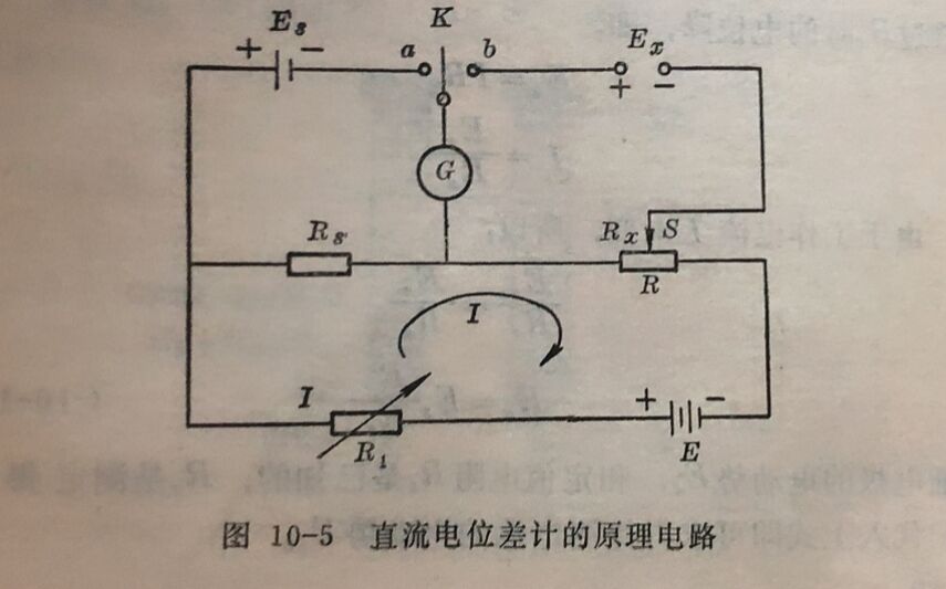 图10-5就是用对消法测电动势的原理图。图中E是作为电源的工作电池(供给工作电流),R₁是调节工作电流用的变阻器, Es是标准电池(电动势已知), Rs是定值标准电阻,Eₓ是待测电池的电动势,Rₓ是待测电动势的补偿电阻(由己知阻值的各电阻所组成)。K是转换开关,G是检流计,S是移动触头。