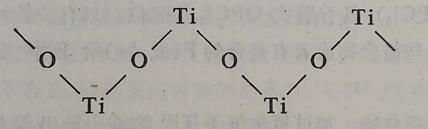 钛(IV)络合物。水合化学;氧合盐。由于电荷-半径比大,所以没有简单的水合Ti4+离子,而且水溶液中存在的已水解物种可以沉淀出碱式氧合盐或水合氧化物。虽然有链式钛氧基TiO2+这种离子,但它既不存在于溶液中,也不存在于晶体盐中,例如TiOSO4·H2O,已证明它具有(TiO)n2n+链: