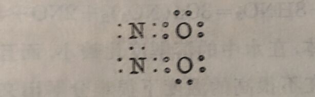 式(I)表示氮原子和氧原子是以三个键相连接,其中一个为三电子键。在氧化氮聚合为双聚分子时,这种三电子键即拆开成为如式(I)构型的分子,从而产生双聚分子: