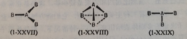 配位数三这里有二种最对称的排列是(1-XXVII)的平面型和(1-XXVIII)的棱锥形,分别属于D3h和C3v对称性。这二种排列在三价中心元素形成的分子中经常遇到。在金属元素络合物中这种配位数是稀少的,几乎所有化学计量为MX3的金属阳离子络合物和化合物,在其结构中都有共用的配位体,使得M的配位数超过三。这里也有少数例外情况存在,像在[(CH3)3S+][HgI3-]中的平面形HgI3-离子,在Cr(NR2)3和Fe(NR2)3(这里R=(CH3)3Si)中的MN3基团和在Cu[SC(NH2)2]3Cl和Cu(SPPh3)3ClO4中的CuS3基团。