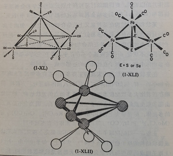 五个顶点 具有五个顶点的多面体有三角双锥(tbp)和四方锥(spy)。二者在硼烷和碳硼烷中均可找到,例如B3C2H5中的tbp和B5H9中的spy,同样在过渡元素中也存在。后者的例子是(C8H12)3Pt3(SnCl3)2中的Pt3Sn2的tbp簇,在Fe5(CO)15C(1-XL)和Fe3(CO)9E2(E=S或Se)(1-XLI)中的spy簇。在共面双八面体中,两个金属原子和三个成桥原子中部排列提供了tbp的一个很普通例子(1-XLII)。