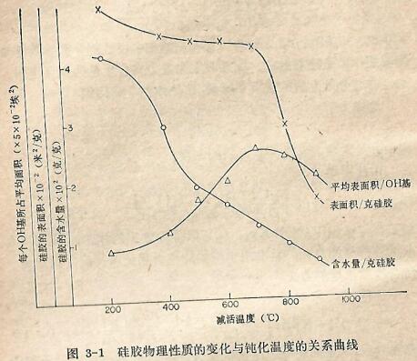 图3-1硅胶物理性质的变化与钝化温度的关系曲线