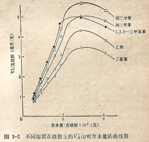 图3-2不同溶质在硅胶上的VˊR/g对含水量的曲线图
