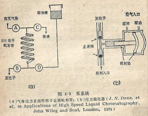 简单的系统如图4-3(a)所示,利用气体钢瓶的压力将溶剂驱出金属蛇形管。这一类型的泵安装在Du Pont和 Chroma-lronix公司的廉价型仪器上,并有合适的安全装置(使仅在适当的时刻才动用钢瓶压力),颇为方便。蛇形管灌注的安排保证他和了气体的溶剂不被送人柱子,阀门则是联锁的,所以当贮液槽仍然开放时,高压气体就不能作用于溶剂。即使如此,对某些型号仍必须注意,不致因为疏忽而使溶剂喷散到整个实验室。这些泵相当不灵便,但价格比较低廉,并且对于中等压力的例行分析是可取的。也可作些小的修改,如采用具有可移动密封垫的柱塞以隔离气体与溶剂的接触,从而消除了存在气液界面的有关问题。另一类广泛采用的恒压泵是压力强化器,以Haskel泵为代表,安装在Du Pont-830和Altex300液相色谱仪中。其工作原理于图4-3( b )中说明。