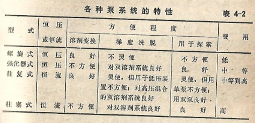主要根据共操作的方便程度,对各种泵系统的主要优缺点进行了评述(6。对于定量的工作,恒流泵显然是重要的,但只要使用中仔细地操作,恒流泵和恒压泵均可适用。有关选择适当泵系统的知识,汇总示于表4-2。