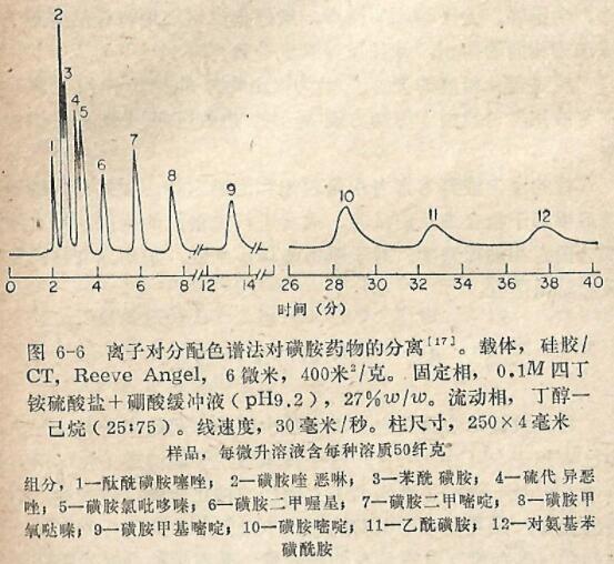 为了说明离子对分配色谱的典型应用,图6-6介绍了12种磺胺药物在微粒硅胶上的分离。一种新型的应用,使用含UV一活性平衡离子的固定相,随后以离子对形式测定非UV-活性的化合物。反相离子对分配色谱法可用于离子性化合物。