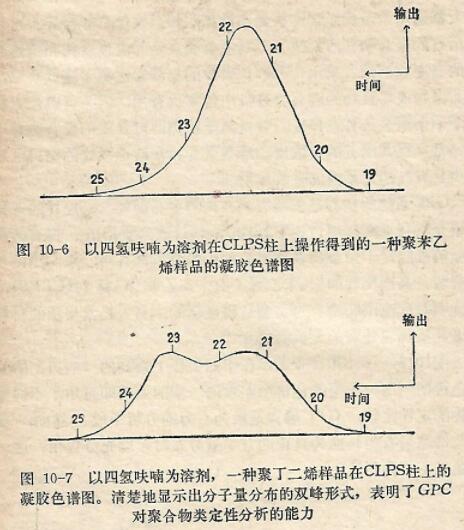 图10 5, 10-6和10-7表示在不同条件下得到的一些典型的凝胶色谱图。这一类型的色谱图无须进.步的处理即可用于不同聚合物的定性比较,GPC 确实是极为有力的分析手段。然而,凝胶色谱图只有当转换为真正的分子量分布时才能充分应用;这一问题在下节内讨论。
