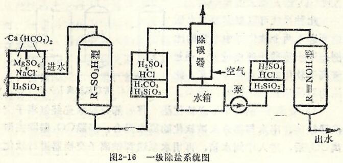 水的除盐与水的软化不同。水的软化仅将水中Ca2+、Mg2+除去,降低水的硬度,因而可以仅用阳离子交换剂,而且可使用盐型(如钠型)树脂。制取除盐水(去离子水)则需将水中组成盐类物质的阴阳离子都除去至一定程度。