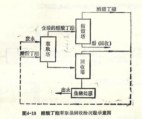 苯乙酮等。萃取在离心萃取机、旋转萃取器或填料萃取塔等设备中进行,其脱酚率可达97%。图4-13为用醋酸丁酯作萃取剂的操作流程示意图。萃取操作在填料塔内进行,萃取后含酚的醋酸丁酯经精馏塔分别回收酚及醋酸丁酯。从萃取塔下部流出的废水再进一步经过生物处理而得净化水。
