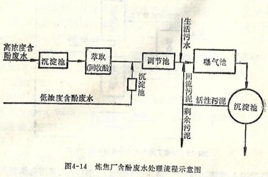 含酚废水的净化处理主要是生物法。使用生物法时要注意废水中不得含有焦油及油类物质,否则会使微生物死亡,因此要先除去油。另外要使水中始终保持有充足的溶解氧。操作时水温约保持在17 ~30℃之间为佳,此温度有利于生物的生化活动。此外,微生物的生命活动还需要有磷、氮养料(要求含氮15mg·L-1以上,磷5mg·L-1以上),而一般含酚废水是缺少的,因此通常将含酚废水与含磷丰富的生活污水混合后再进行生物处理。图4-14为某炼焦化工厂含酚废水处理流程简图。