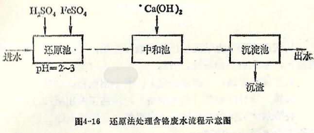 如对于Cr6+的废水,可用Fe作阳极,电解时阳极氧化溶解生成Fe2+, Fe2+又使Cr6+还原成Cr3+。在阴极是水中H+放电成H2,溶液pH值逐渐变大呈碱性,于是Cr8+及Fe2+成氢氧化物沉淀而去除。这实质为还原法,所以也可用向废水中加入还原剂使Cr6+→Cr3+→Cr(OH)3↓而除去。常用还原剂有FeSO4、Na2SO3、SO2、Fe等。流程示意图为: