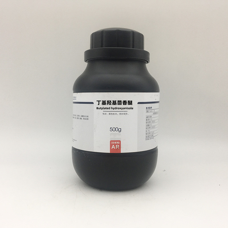 丁基羟基茴香醚,又名叔丁基-4-羟基茴香醚、白色片状结晶粉末,基本无臭,无味,熔点69.5~71.5℃,沸点265℃,对热相当稳定。接触金属离子,特别是铁离子不显色,抗氧化效果良好。加热时与水蒸气一起挥发。不溶于水、甘油和丙二醇,而易溶于乙醇(25%)和油脂。例如易溶于动植物油,与金属离子作用不会着色,易受阳光、热的影响 。